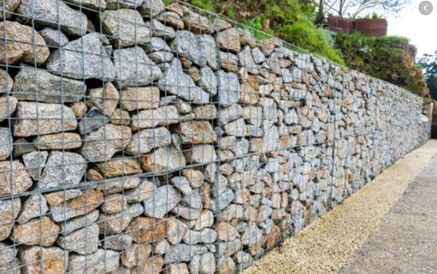 - Gabion Retaining Wall — wire mesh baskets filled with stone or rock